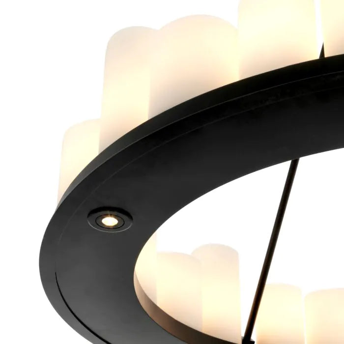 It features a plate with 24 tapered faux pillar candles which suggest the authentic formation of melting wax. The bottom of the plate features 4 recessed LED downlights. The lights in this chandelier can be turned on and off by using the included remote control. Several different settings are possible. Please note: this chandelier is not dimmable and cannot be used with a dimmer.