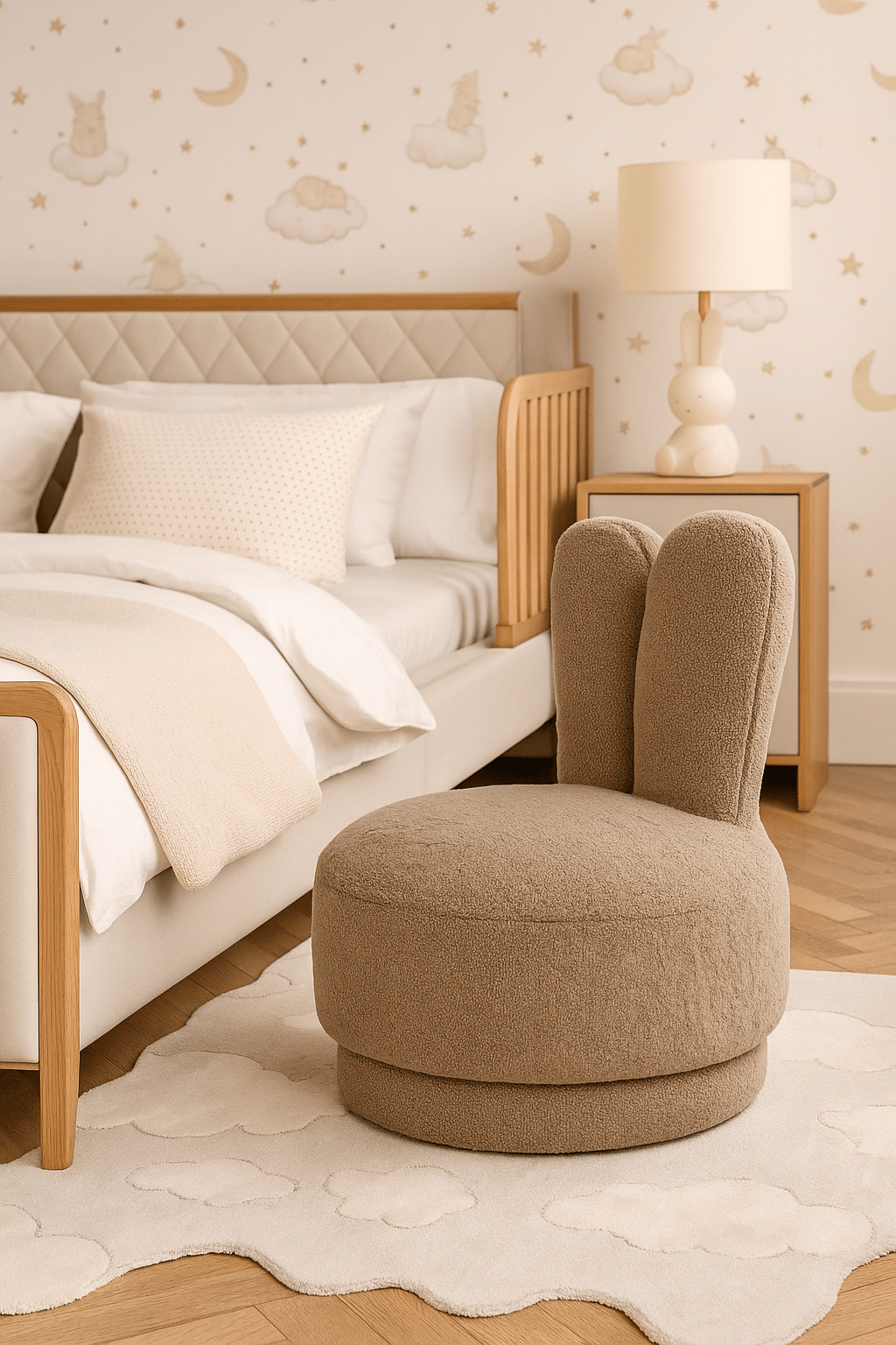 Swivel chair Bunny for children comes in a soft taupe teddy fabric and combines comfort with a playful design. Thanks to its swivel function and cozy material, this chair is perfect for the nursery or play corner, and a favorite with any child who loves cozy seating as well as movement.